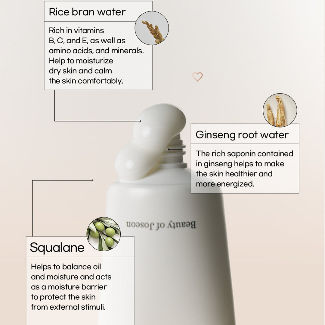 Water, Oryza sativa (rice) bran water, Glycerin, Panax ginseng root water, Hydrogenated polydecene, 1,2-Hexanediol, Niacinamide, Squalane, Butylene glycol, Propanediol, Butylene glyco. dicaprylate/Dicaprate, Cetearyl olivate, Sorbitan olivate, Ammonium acryloyldimethyltaurate/VP Copolymer, Xanthan gum, Acrylates/C10-30 alkyl acrylate crosspolymer, Tromethamine, Carthamus tinctorius (safflower) seed oil, Hydrogenated coconut oil, Glyceryl acrylate/acrylic acid copolymer, Ethylhexylglycerin, Adenosine, Caprylic/Capric triglyceride, Disodium EDTA, Hyaluronic acid, Hydrolyzed hyaluronic acid, Sodium hyaluronate, Honey extract, Ceramide NP, Hydrogenated lecithin, Coptis japonica root extract, Raphanus sativus (radish) seed extract, Lycium chinense fruit extract, Theobroma cacao (cocoa) seed extract, Phellinus linteus extract, Dextrin, Scutellaria baicalensis root extract