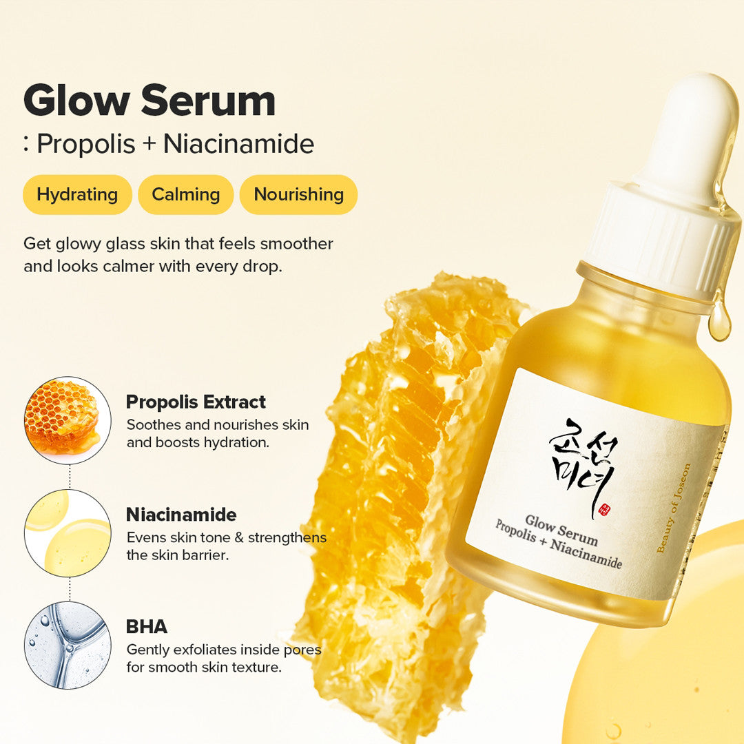 The Glow Serum, infused with 60% propolis extract, and 0.5% BHA is a natural antiseptic, perfect for acne-prone skin. It calms irritation, promotes healing, fades scars, and brightens skin tone.