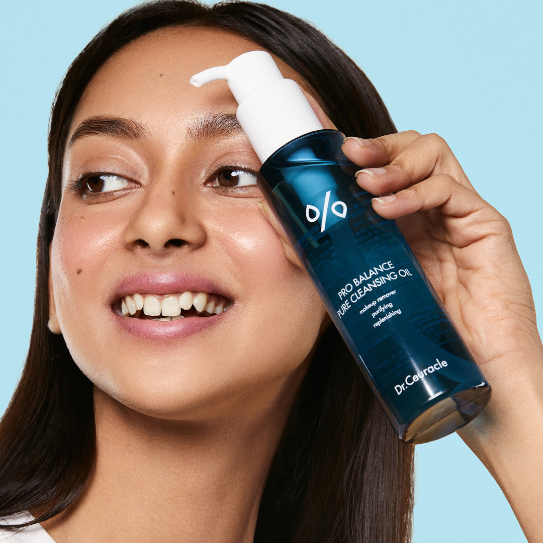 Dr.Ceuracle Pro Balance Pure Cleansing Oil removes makeup, impurities, and sunscreen. Formulated with 44% Sunflower seed, Jojoba, Olive, Meadowfoam seed, and Macadamia nut oils. Suitable for all skin types, the cleansing oil also strengthens skin barrier.