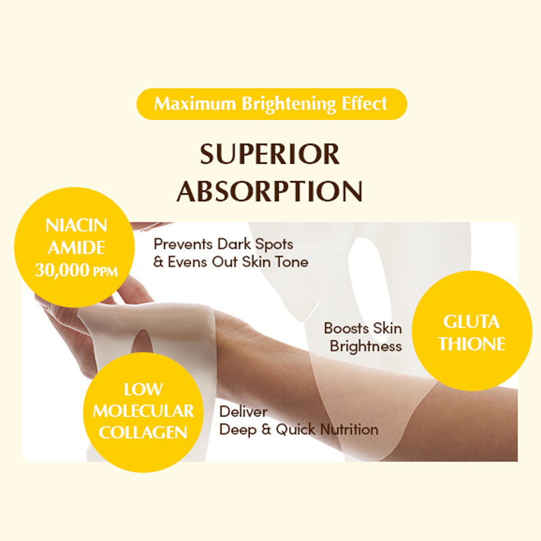 The mask’s toning and brightening effects are powered by high-potency Niacinamide (30,000 PPM), which refines and brightens the skin, while 99% pure Glutathione targets dullness and hyperpigmentation, effectively preventing dark spots and evening out skin tone.
