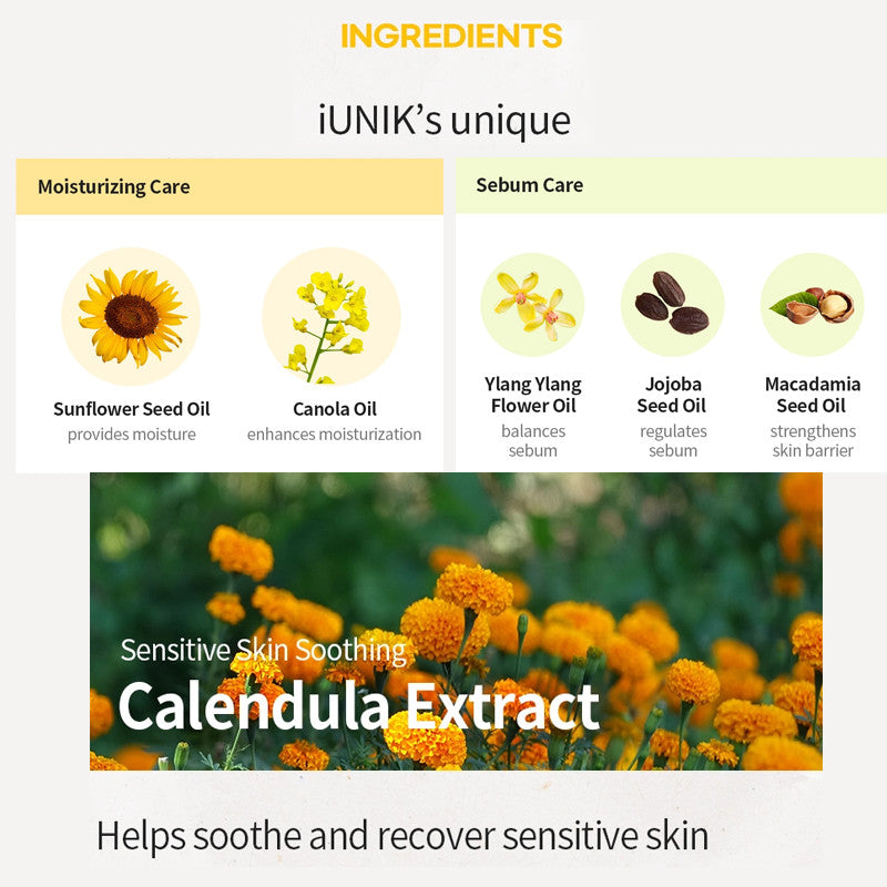 IUnik Calendula Complete Cleansing Oil: Effortlessly removes makeup residue and impurities, leaving your skin fresh and moisturized. Ideal for dry, oily, sensitive and combination skin.
