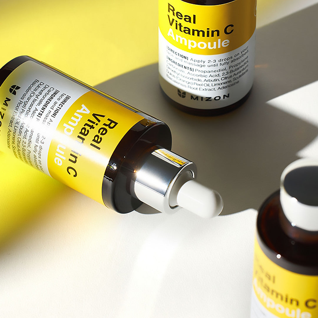 Mizon Pure Vitamin C Ampoule: 19% potent Vitamin C evens tone, reduces spots, hydrates, and strengthens skin. Clinically proven benefits include pore reduction and brightness.